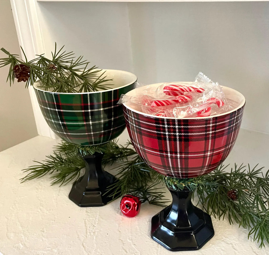 This set of plaid Christmas bowls will add a splash of happy to your home! These pedestal bowls can be used as a centerpiece, candy bowl or serving pieces. they will look stunning on your mantle. tiered tray, table or kitchen island!. They each measure 7" tall, you will receive 2 plaid bowls( the pattern on each will vary)36.00